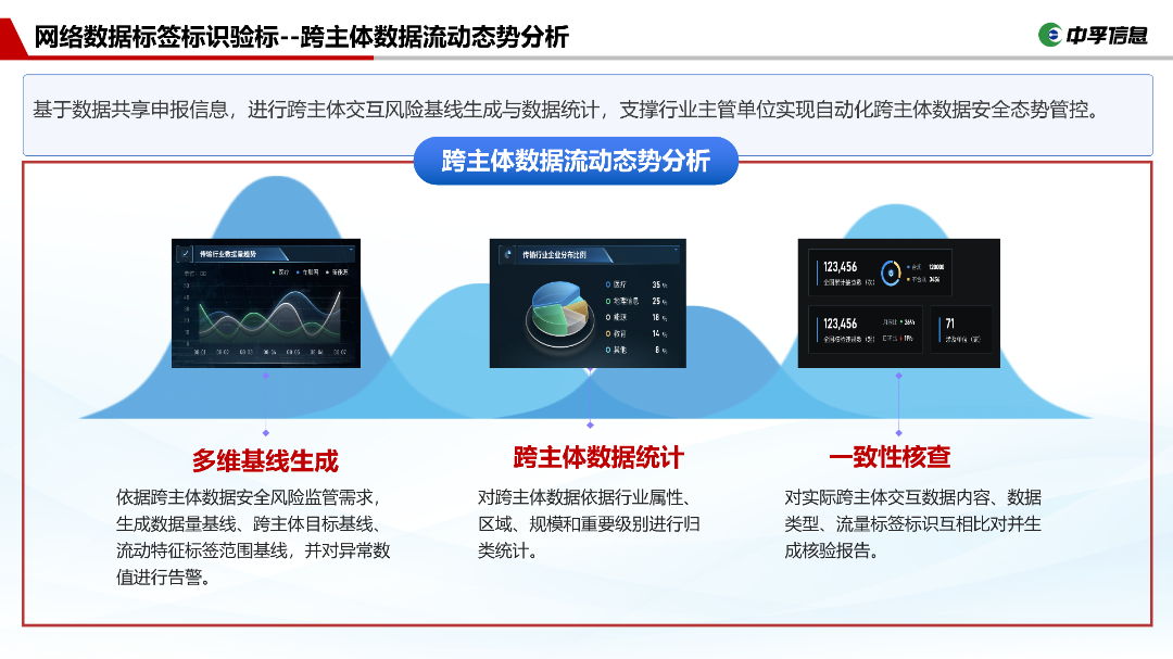 构建多维风险监测体系,生成数据量、跨主体目标、流动特征标签范围等多重基线,对异常数值实时告警;同时实现跨主体数据的分类统计与一致性核查;